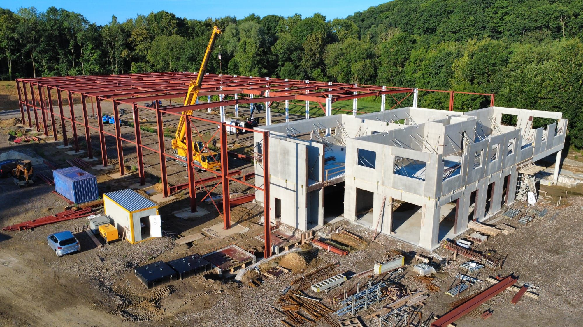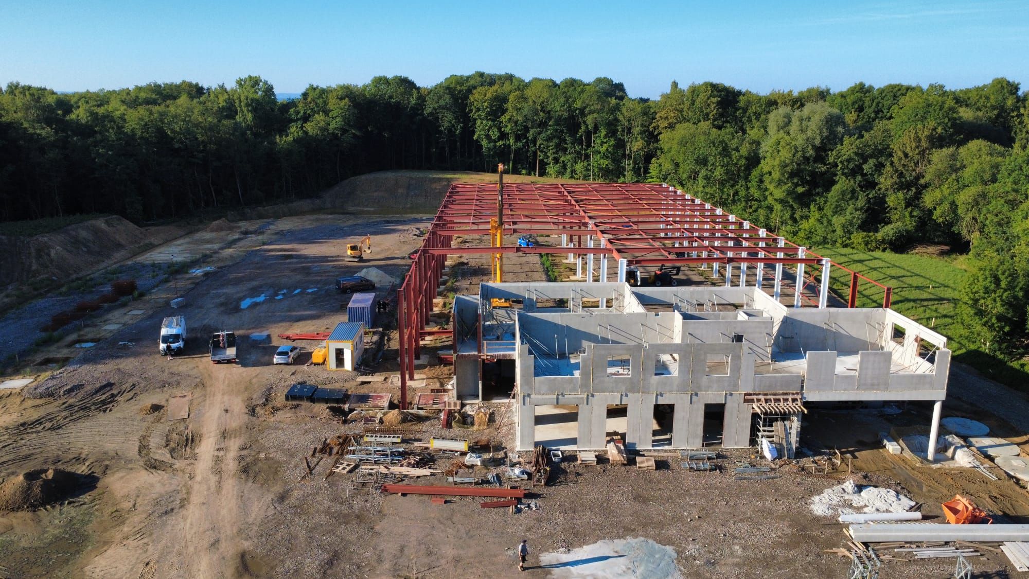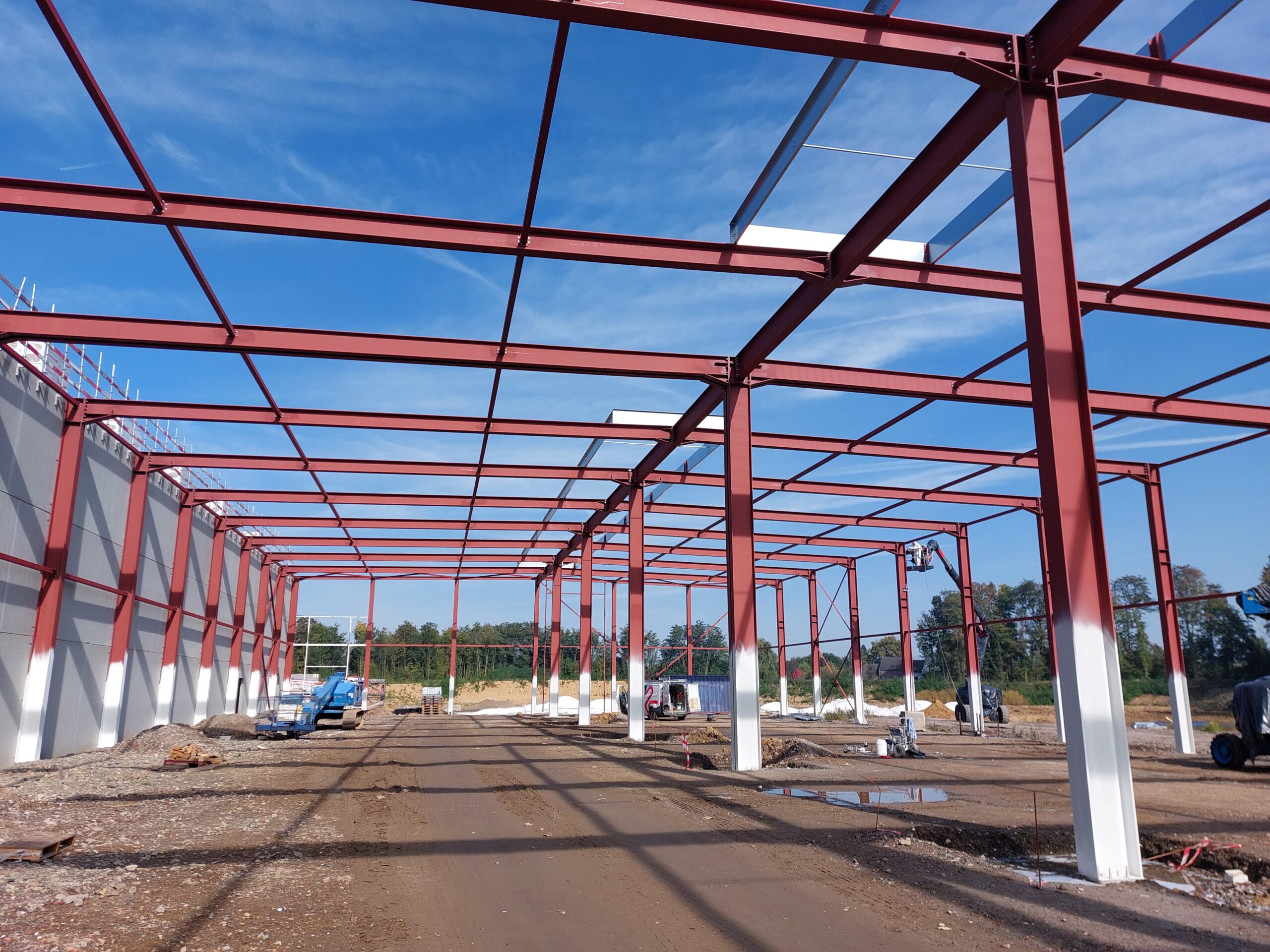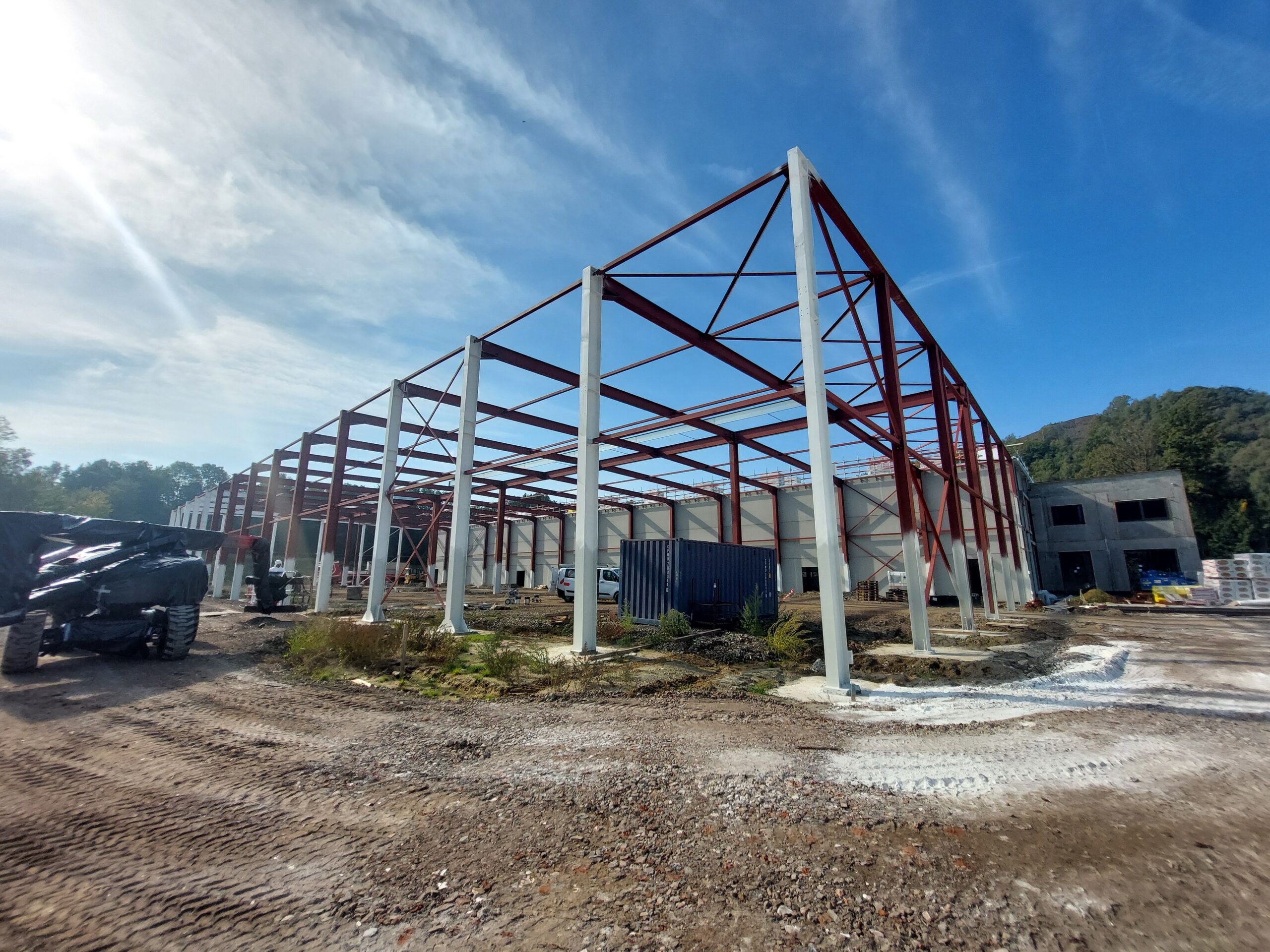 - Juillet 2025 : Montage de l’ossature métallique des halls